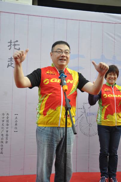 左一、海口市体育总会赵建生会长、左二、江苏捷安特自行车文体基金会理事长朱雄瑜、右一、秘书长丁艳艳,右二海口市自行车运动协会严春江会长出席并护骑。