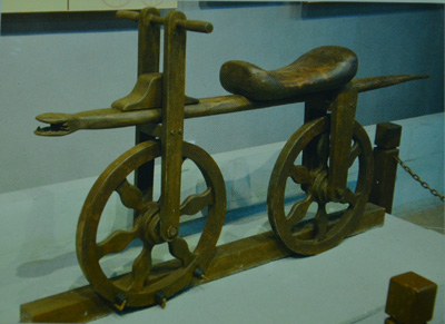 自行车起源很早,在1766年一群意大利的修士在整理达芬奇的手稿时,发现他在1492年就绘制了一张自行车的草图,与1867年皮埃尔米少克斯发明的那辆车几乎是完全一样的。而后在1508年的意大利的殿堂上也有一幅“小天使驾车行云图”,也就是说自行车的起源可以追溯到15世纪了。但这是人们的一个想象,并没有真的实物出现。而得到世界公认的实在1790年由法国的一名伯爵发明的自行车。法国的西夫拉克伯爵在一个下雨天,在拥挤街头被经过的四轮马车溅了一身泥,这一个场景时他突发奇想:四轮马车这么宽,应当把马车顺着切掉一半,四个轮子变成前后两个车轮,那么街道就不会这样拥挤了,于是1790年第一辆代步的“木马轮”小车诞生了。这辆小车有前后两个木质轮子,中间连着横梁,上面安了一条板凳,像一个玩具。这辆“木马轮”没有传动链条,又无转向装置,骑行时是靠双脚踩踏地面前行,在需要拐弯时,骑行者要下车来调整好方向,然后再上车前行,骑动起来非常麻烦,所以也被当时的人们称之为“伯爵的玩具”或“变瘦的马车”。