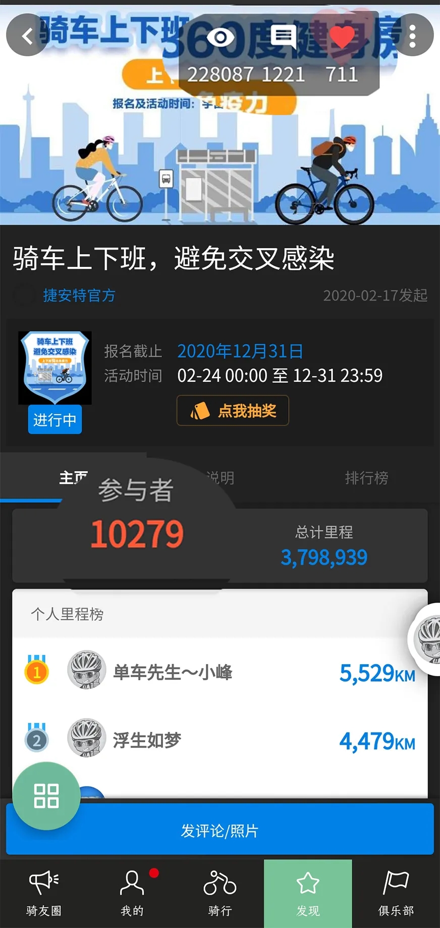 活动有22w的浏览量,并且有10279位参与到我们“骑车上下班”活动中,